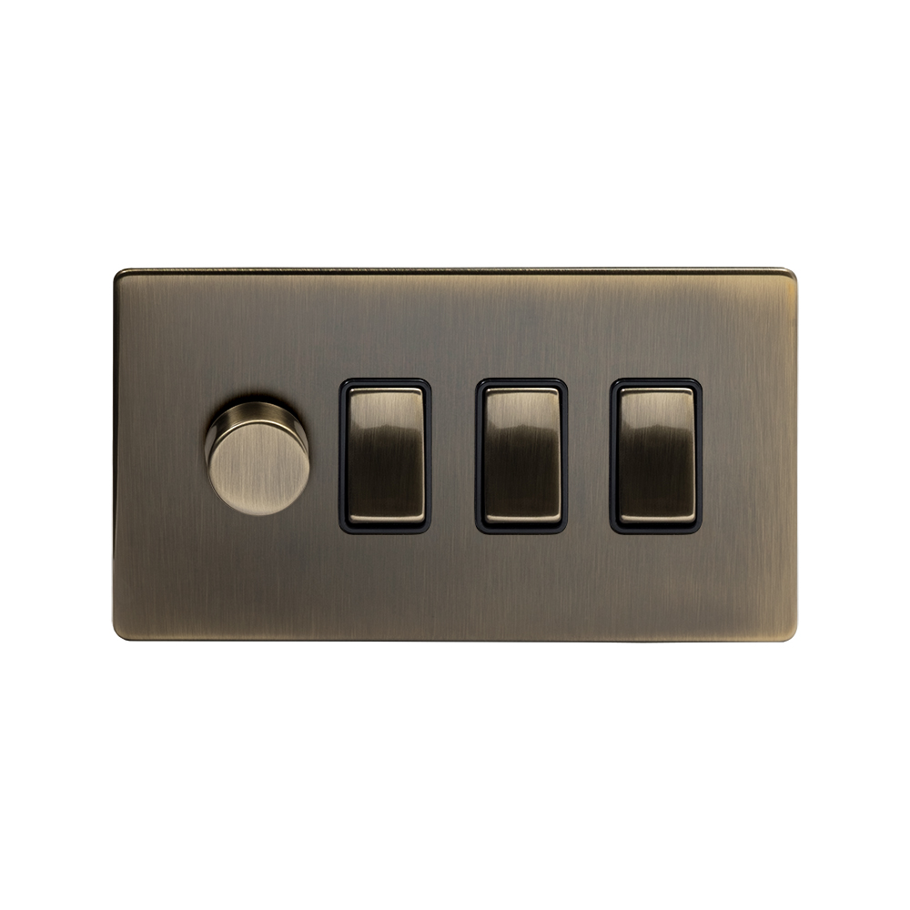 Soho Lighting Antique Brass 4 Gang Dimmer and Rocker Switch Combo (1 x 2 -Way Intelligent Dimmer & 3 x 2 -Way Switch)