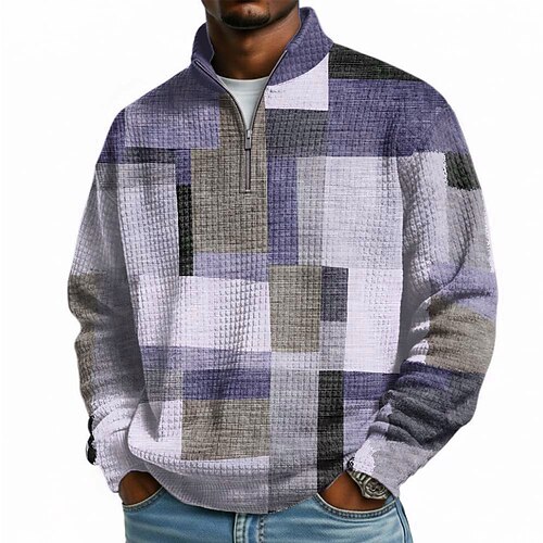 Per uomo Geometrico Plaid Nido d'ape Felpa Moda Quotidiano Classico Casual Collo alla coreana Zip a un quarto All'aperto Casa Ufficio Lavoro Giallo Viola Arancione Grigio Con zip Autunno Inverno