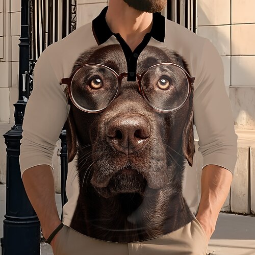 Per uomo Animale Cane Polo Manica Lunga Magliette polo Bavero Casual All'aperto Streetwear Athleisure Abbigliamento quotidiano Stampa 3D Bottoni Primavera Autunno Inverno Marrone scuro Nero