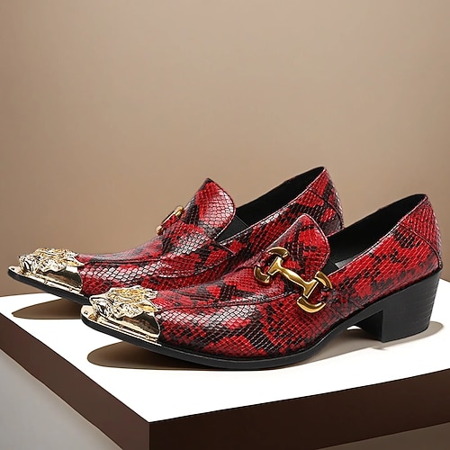 mocassini da uomo con stampa serpente rossa e dettagli dorati: design slip-on elegante, perfetto per le celebrazioni natalizie e le festività di Capodanno in un ambiente decorato con decorazioni natalizie