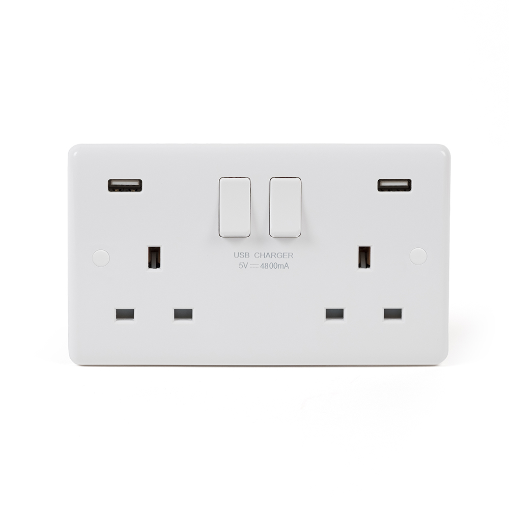 Lieber Silk White 13A 2 Gang DP Fast Charge 4.8amp Double Socket with USB - Curved Edge - Size: H 86mm X W 146mm X D 4.5mm,