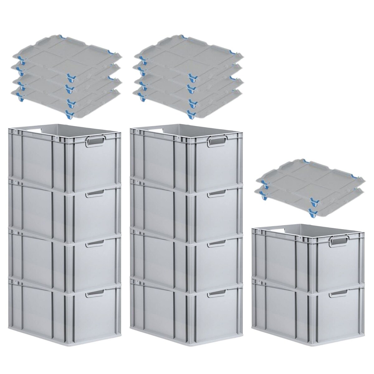 PROREGAL SparSet 10x Eurobox NextGen Economy mit Auflagedeckel & 4x Verschlüsse Blau, Griffe offen, HxBxT 32x40x60cm, 65L, Eurobehälter, Box