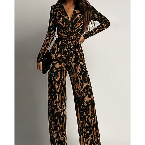 Per donna Tuta Elegante Tinta unica Manica Lunga Gamba larga Scollo a V Allacciato Vacanza Casa Top aderente Marrone Autunno