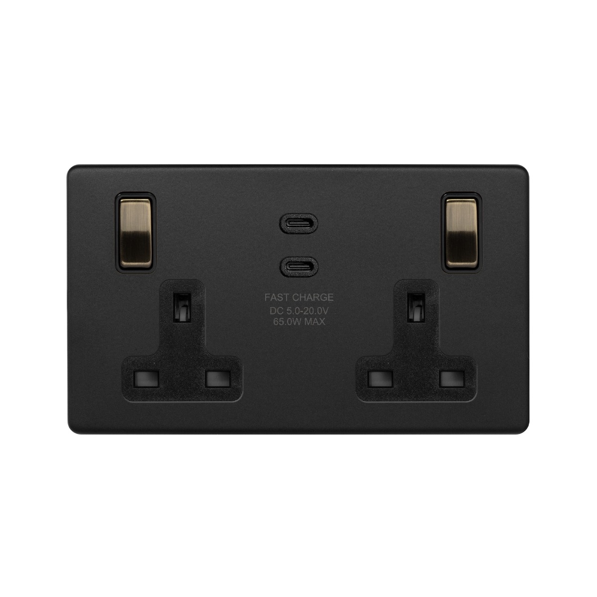 Soho Lighting Matt Black & Antique Brass 2 Gang 65W USB C+C Socket (13A Socket + 2 USB C Ports) - Size: 86mm x 146mm x 4.5mm