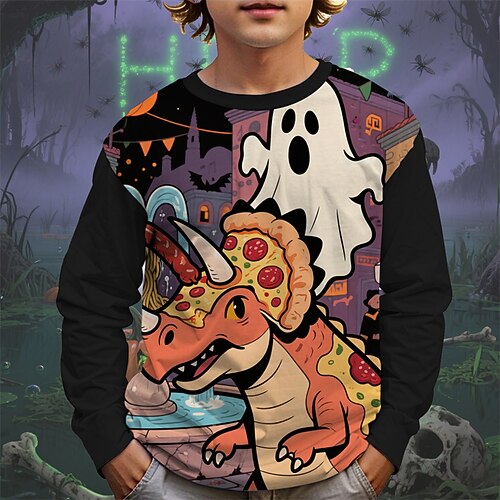 Halloween Jungen 3D Cartoon Kürbis Dinosaurier T-Shirt Langarm Frühling Herbst Mode Basic Kinder 4-12 Jahre Rundhalsausschnitt Outdoor Lässig Täglich Normale Passform
