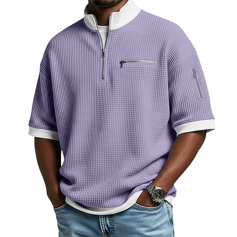 Men's Waffle T-shirt Tee Top Short Sleeve Pullover Half Zip Summer Solid Color Fashion Designer Comfortable Patchwork Color Block Zipper Pocket Casual Daily Outdoor Light Blue Black Purple Top Tee