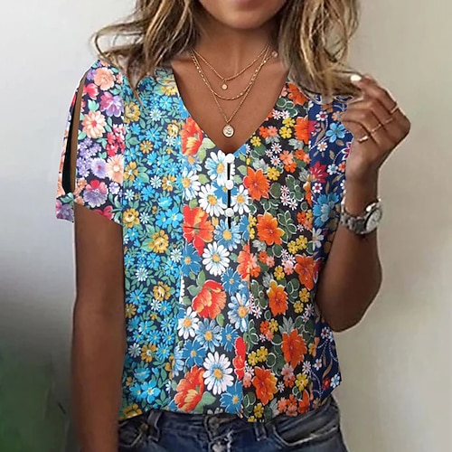 Per donna Maglietta Floreale Moda Casual Boho Manica Corta Scollo a V Top Regolari Quotidiano Weekend Stampato Blu Bianco Blu Reale Viola Verde Estate Primavera