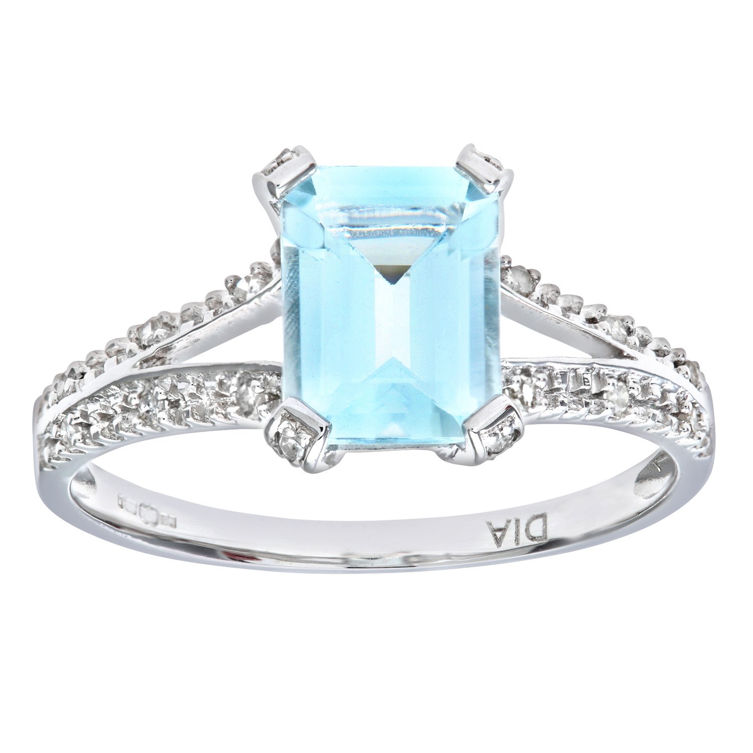 Diamant L'eternel Womens 9ct White Gold Emerald Cut Aquamarine Ring With Diamond Shoulders - Size J