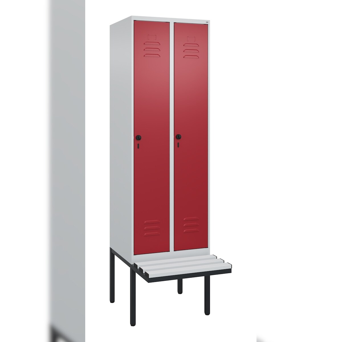 C+P Spind Classic PLUS, Kunststoff schwebende Sitzbank, 2 Abteile, HxBxT 212x60x82cm, Sicherheitsdrehriegel, Hellgrau/Rubinrot von PROREGAL