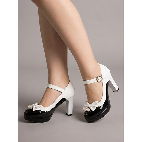 Scarpe da donna classiche anni '50 modello Mary Jane vintage - eleganti décolleté con fiocco bianco e nero e tacco a blocco per tea party retrò e lavoro in ufficio. eventi formali