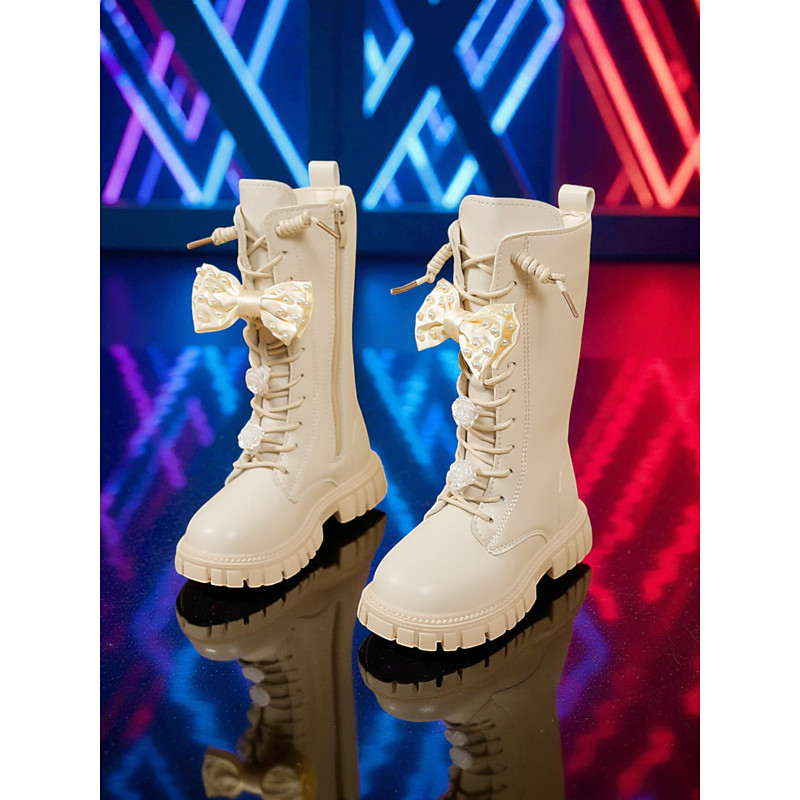 Kid's Korean Idol Inspired Pop Star Costume Shoes - White Faux Leather Boots with Bow and Pearl Decoration, Ideal for Dress-up, Holiday Parties, and Themed Events