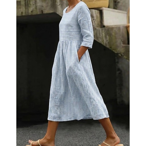Per donna Abito Midi Vestito Casual Abito a trapezio Elegante Casual Vacanza Quotidiano Vestibilità comoda A righe Manica Corta Girocollo Grigio Azzurro Estate Primavera