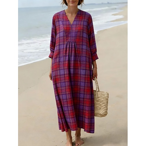 Per donna Abito Midi Vestito Casual Abito a Tubino Vintage Quotidiano All'aperto Vacanza Vestibilità comoda Plaid Manica Lunga Scollo a V Viola Estate Primavera Autunno