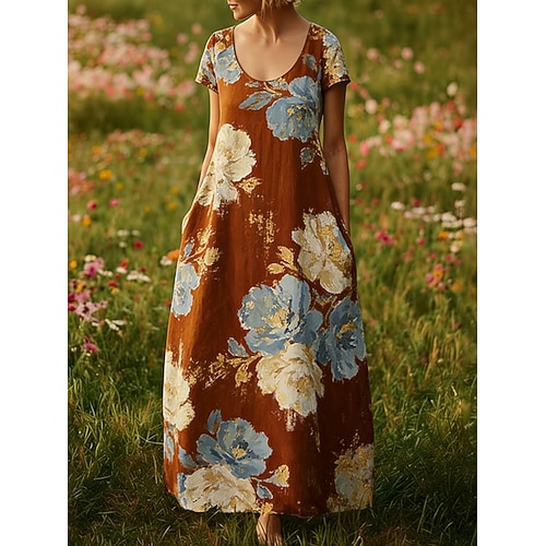 Per donna Abito lungo maxi Abito Boho Vestito Casual Vintage Quotidiano All'aperto Spiaggia Vestibilità comoda Floreale Manica Corta Collo a U Vino Estate Primavera