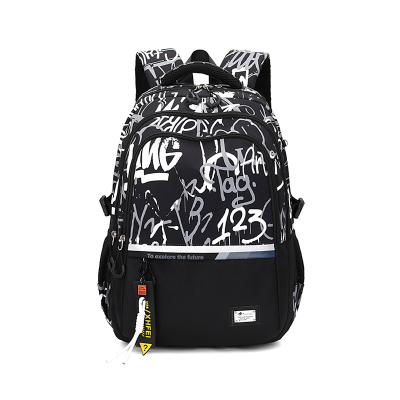Waterproof Graffiti Print School Backpack for Teens – Large Capacity Black Bookbag with Padded Laptop Compartment, Stylish Travel Bag for Boys and Girls