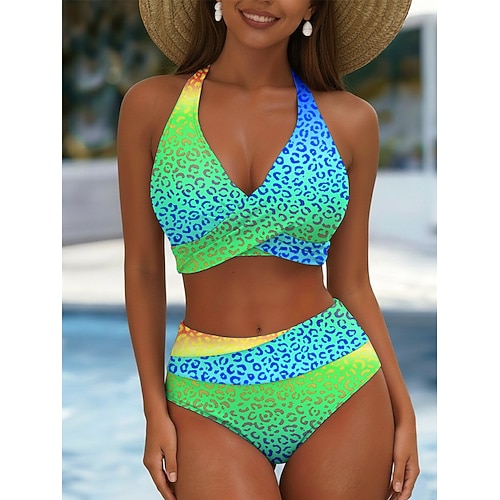 Damen Bikini 2-teiliger Badeanzug Leopard Rock Mode Stylisch Grafik V-Ausschnitt Ärmellos Badeanzüge