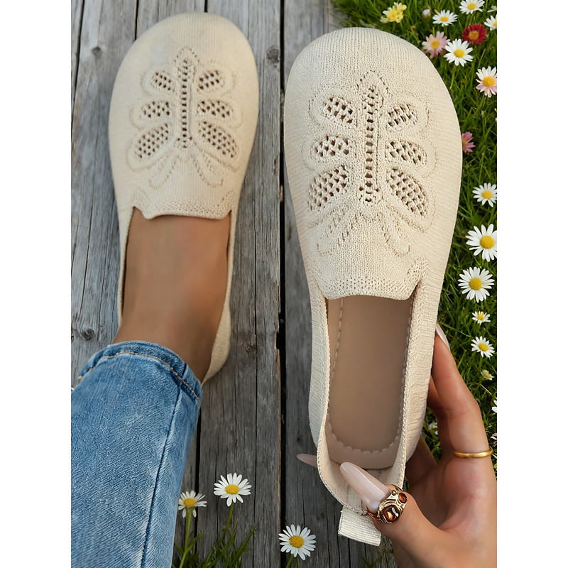 Women's Light Brown Knitted Slip-On Shoes with Butterfly Pattern – Breathable Flat Shoes for Summer Walking, Driving Casual Comfort