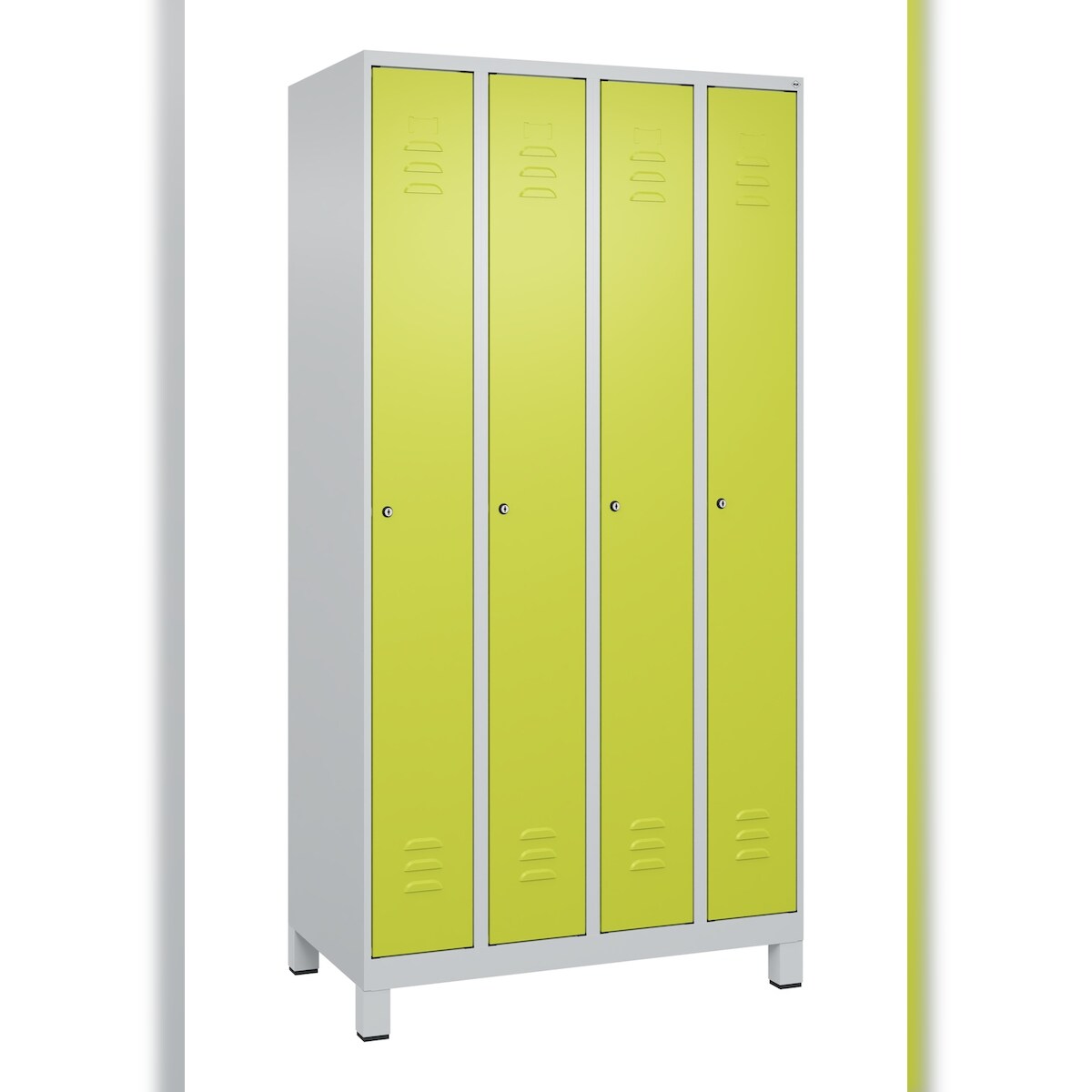 C+P Spind Classic PLUS, Füßen, 4 Abteile, HxBxT 195x100x50cm, Zylinderschloss, Hellgrau/Clowngrün von PROREGAL