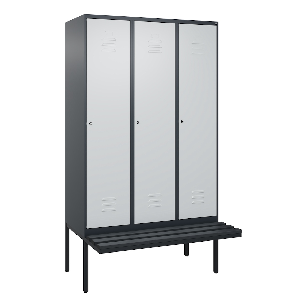 C+P Spind Classic PLUS, Kunststoff schwebende Sitzbank, 3 Abteile, HxBxT 212x120x82cm, Zylinderschloss, Anthrazit/Hellgrau von PROREGAL