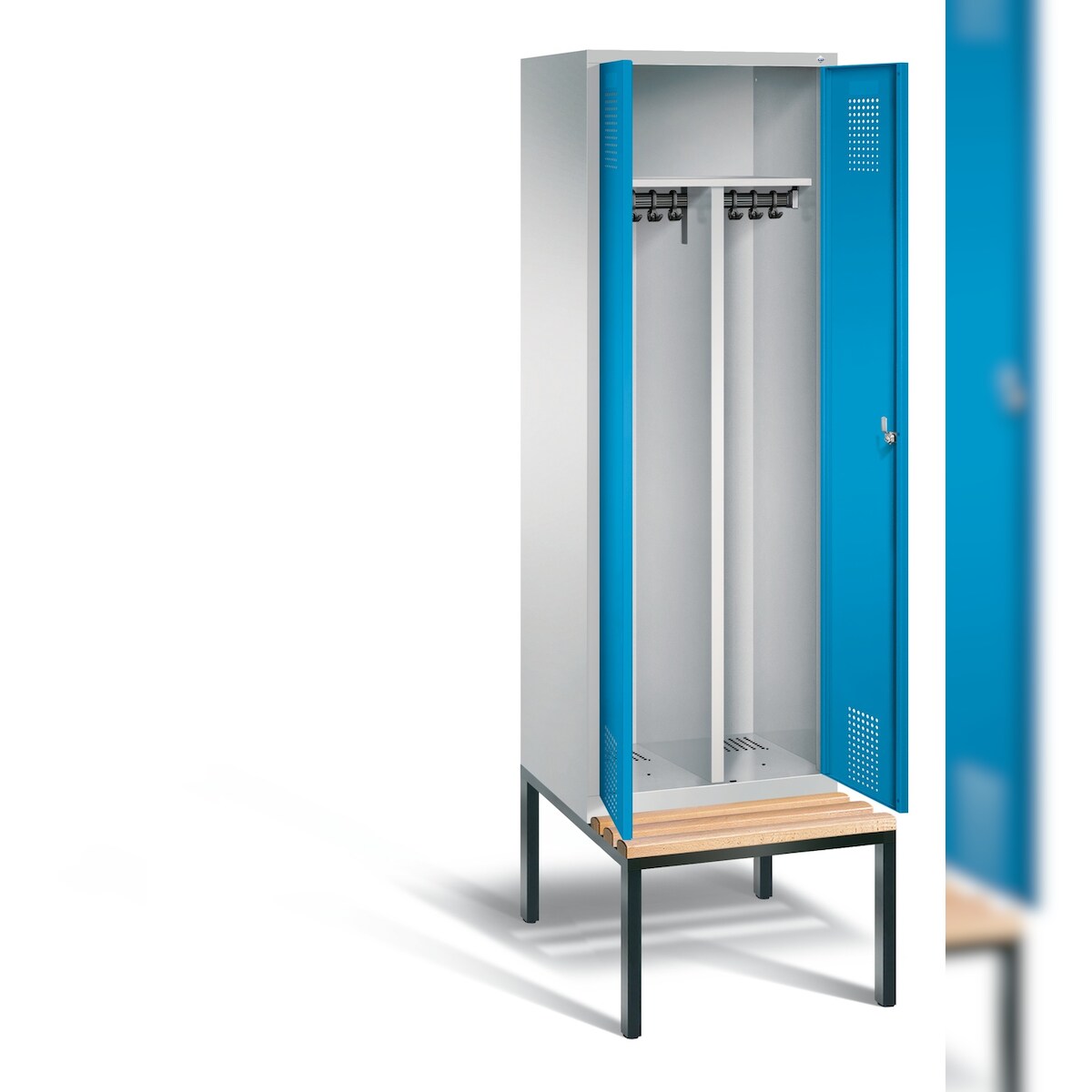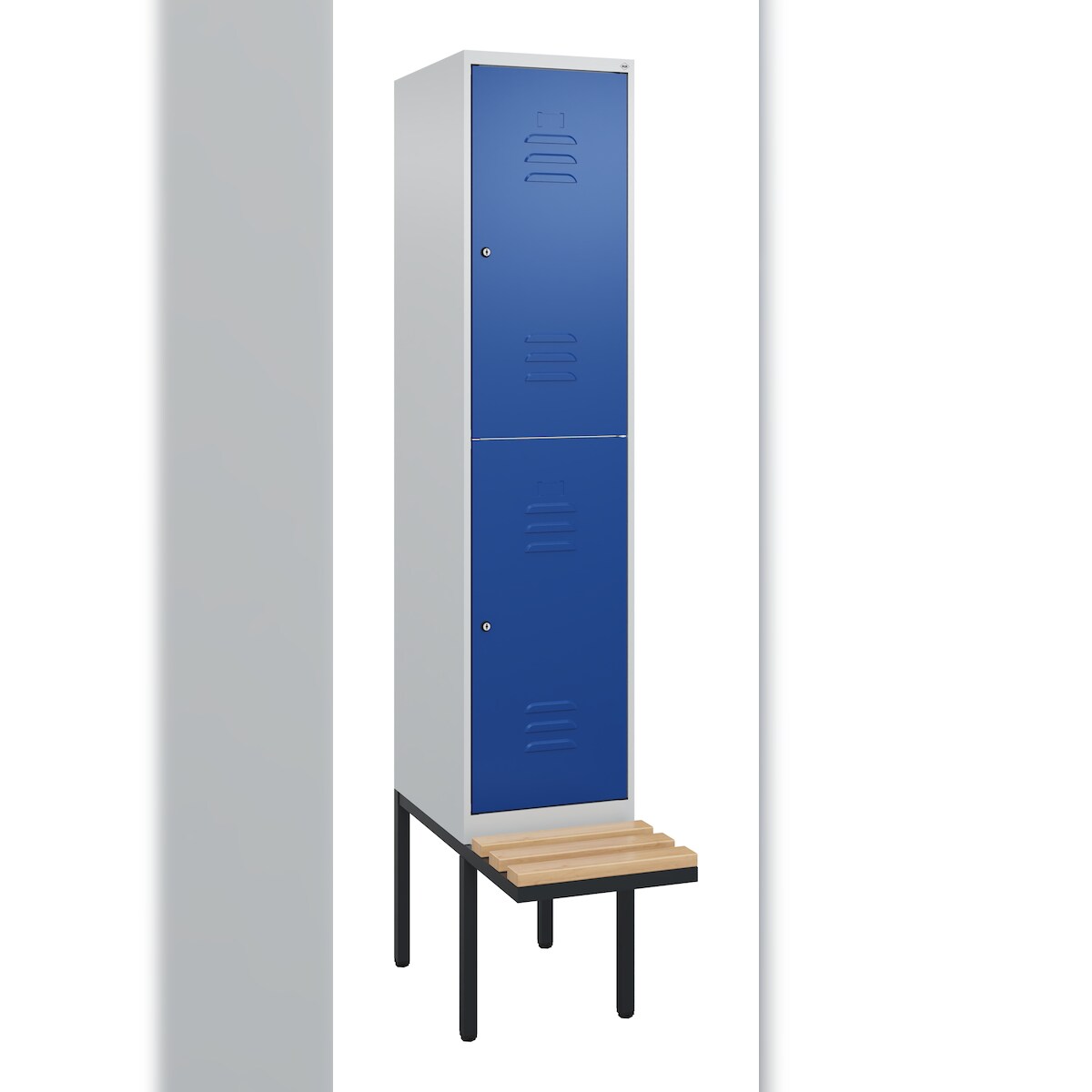 C+P Spind Classic PLUS, Buche schwebende Sitzbank, 2 Abteile, HxBxT 212x40x82cm, Zylinderschloss, Hellgrau/Enzianblau von PROREGAL