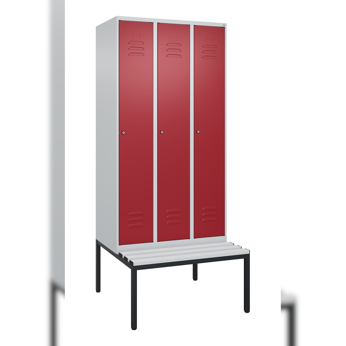 C+P Spind Classic PLUS, Kunststoff untergebaute Sitzbank, 3 Abteile, HxBxT 212x90x82cm, Zylinderschloss, Hellgrau/Rubinrot von PROREGAL