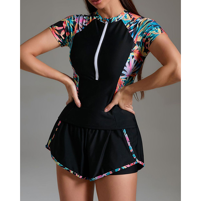 Women's Rash Guard Bathing Suit 2 Pieces Printed Ultra Light (UL) UV Protection Elastic Short Sleeve Swimwear Zip Up Surfing Snorkeling Summer