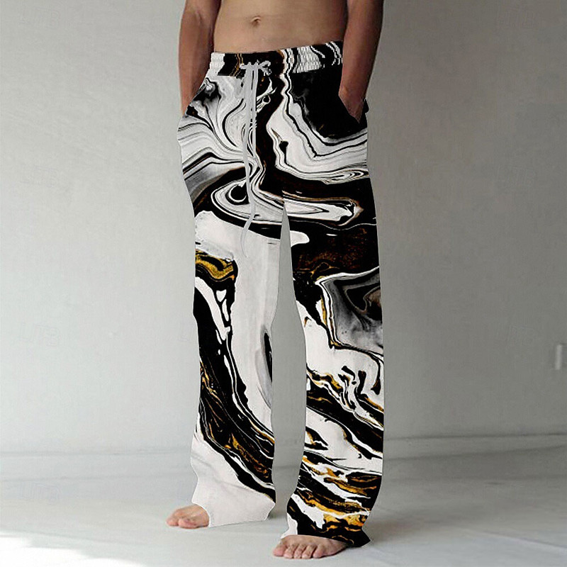 Men's Marble Abstract Liquid Art Trousers Baggy Pants Casual Pants Mid Waist Casual Outdoor Vacation Daily Drawstring Elastic Waist Wide Leg Summer Spring 3D Print Black Yellow Green