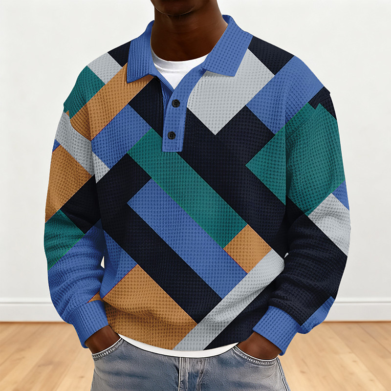 Men's Color Block Geometic Waffle Polo Shirts Long Sleeve Polo Shirts Lapel Sportswear Casual School Athleisure Daily Wear 3D Print Spring Fall Winter Blue Red Orange