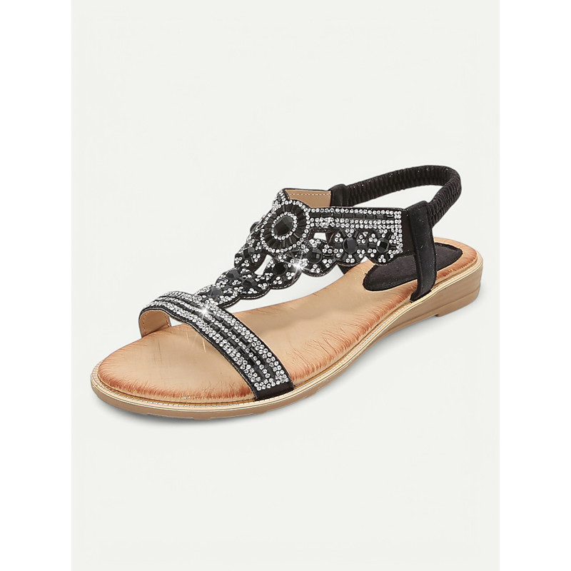 Women's Bohemian Style Flat Sandals with Beaded Embellishments and Elastic Strap, Comfortable Summer Shoes for Beach and Casual Outings