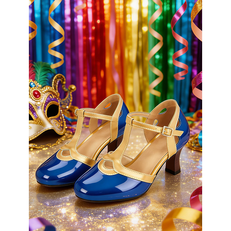 Women's Mardi Gras Red and Gold T-Strap Heels with Metallic Accents Mary Jane– Perfect for Carnival, Festivals and Fun Celebrations