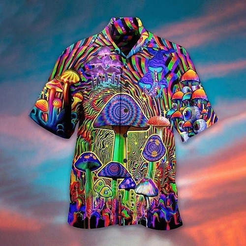Herren Hippie Pilz Hemd Hawaiihemd Sommerhemd Knopfhemd Kurze Ärmel Tropisch Hawaiianisch Designer Casual Hawaiianisch Ausgehen Sommer Frühling Umlegekragen Bedruckt Button-Down Schwarz Schwarz