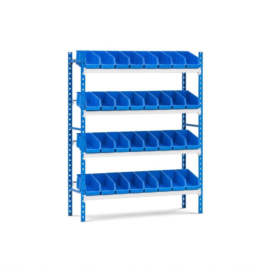 PROREGAL Schrägbodenregal MAXIMUS mit 32x Sichtlagerboxen à 5,6L Fachlast 130kg Grundregal HxBxT 160x125x40cm 4 Ebenen Lichtblau/Lichtgrau