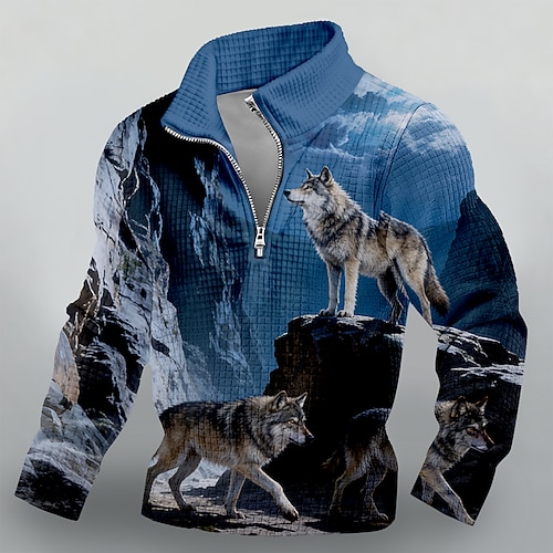 Per uomo Lupo Nido d'ape Felpa Moda Quotidiano Da caccia Collo alla coreana Zip a un quarto All'aperto Abbigliamento casual alla moda Viaggio Campeggio Blu 1 Blu 3# Blu 2# Con zip Autunno Inverno