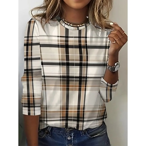 Per donna Maglietta Grafico Geometrico Plaid Vintage Moda Elegante Manica Lunga Girocollo Top Regolari Quotidiano Weekend Stampato Verde chiaro Rosa Vino Verde militare Rosso Primavera Autunno Inverno