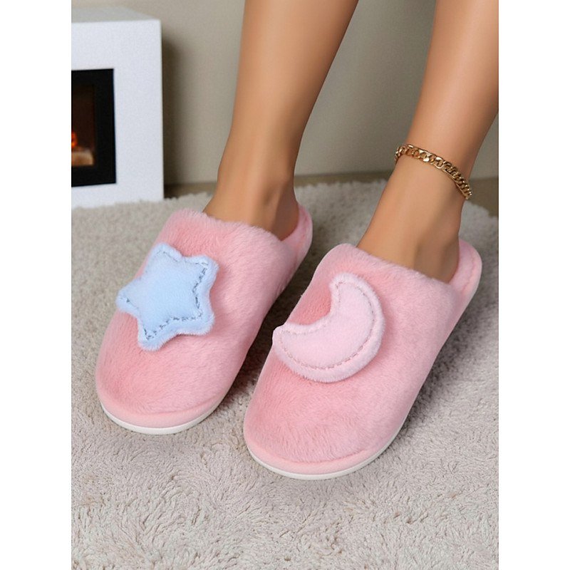 Women's White Plush Indoor Slippers with Star and MoonDecoration, Soft Warm Fleece Lining, Cute Cozy House Shoes for Winter Bedroom Home Wear