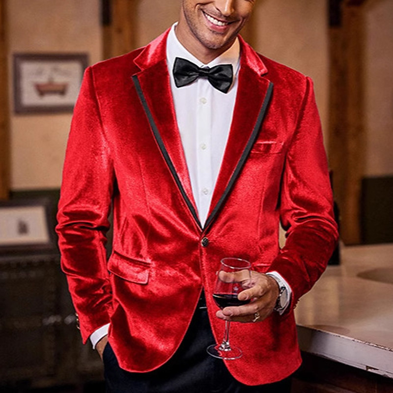 Men's Velvet Blazer Notch Collar Christmas Party Sparkle Solid Colored Velvet Blazer Blue Black Red Tailored Fit Single Breasted One-button