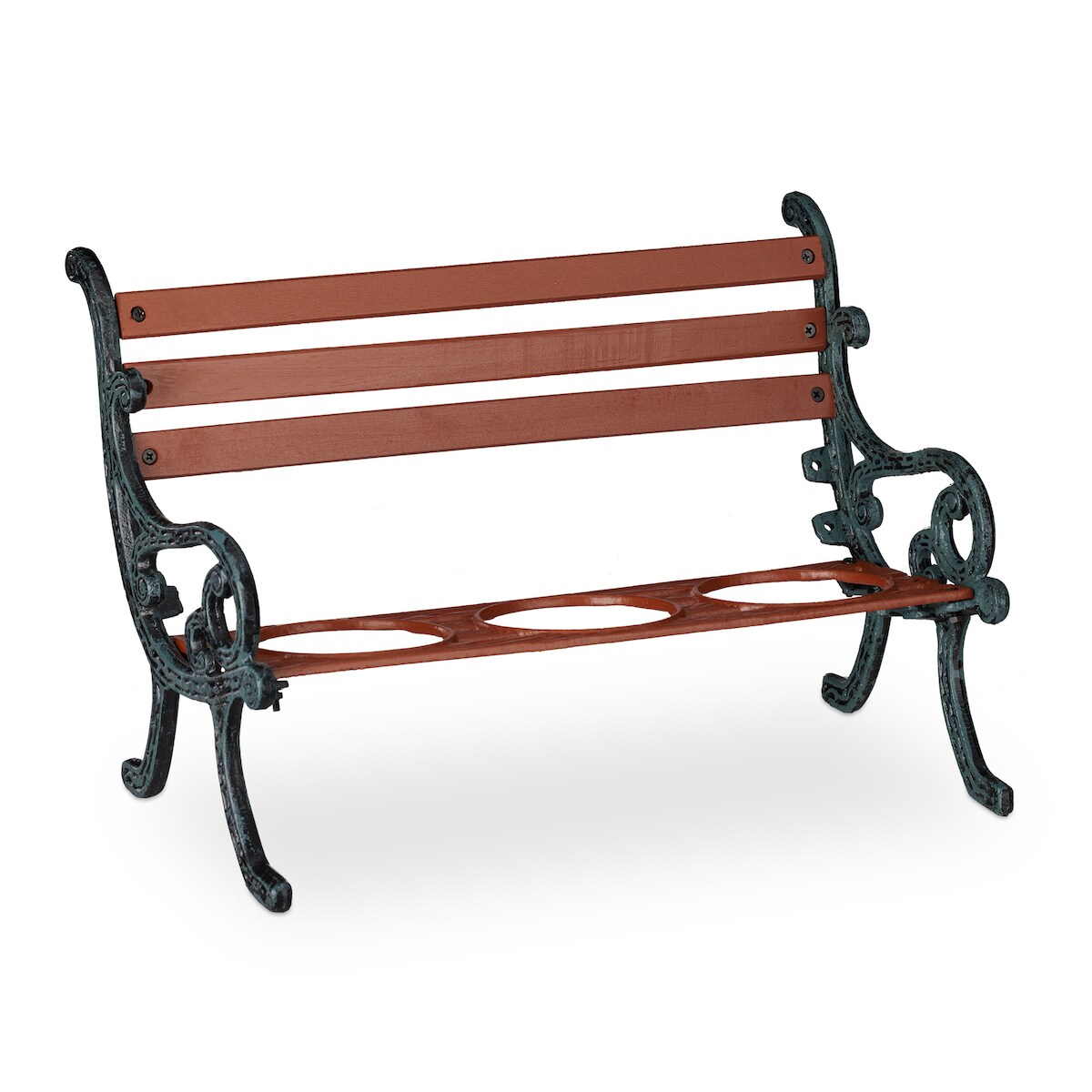 Relaxdays Mini Blumenbank, Gusseisen & Holz, Blumenständer für 3 Blumentöpfe, Ø 9 cm, Garten Deko Bank, braun/grau-grün