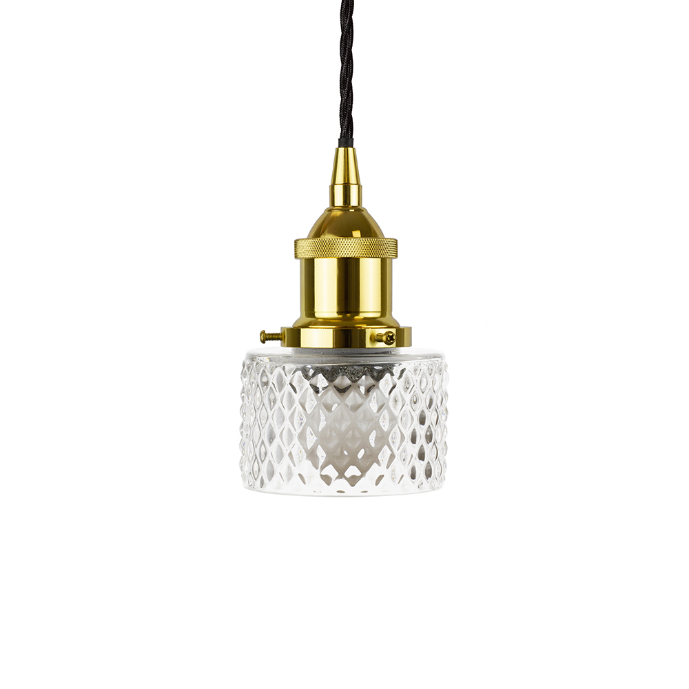 Cylinder Ribbed Glass Pendant Light with Matt Antique Brass Lamp Holder and Black Twisted Cable - The Soho Lighting Company