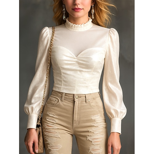 Per donna Blusa Tinta unica Elegante Essenziale Manica Lunga Collo Alto Top Regolari Quotidiano Patchwork Rete Bianco Primavera Autunno