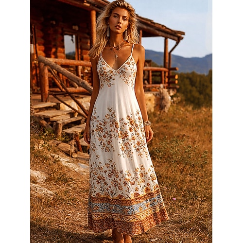 Per donna Abito maxi Vestito Estivo Abito a trapezio Abito Sottoveste Vacanza Casual Boho Spiaggia Vestibilità regolare Floreale Grafico Senza Maniche Scollo a V Spalline sottili Blu Marrone chiaro