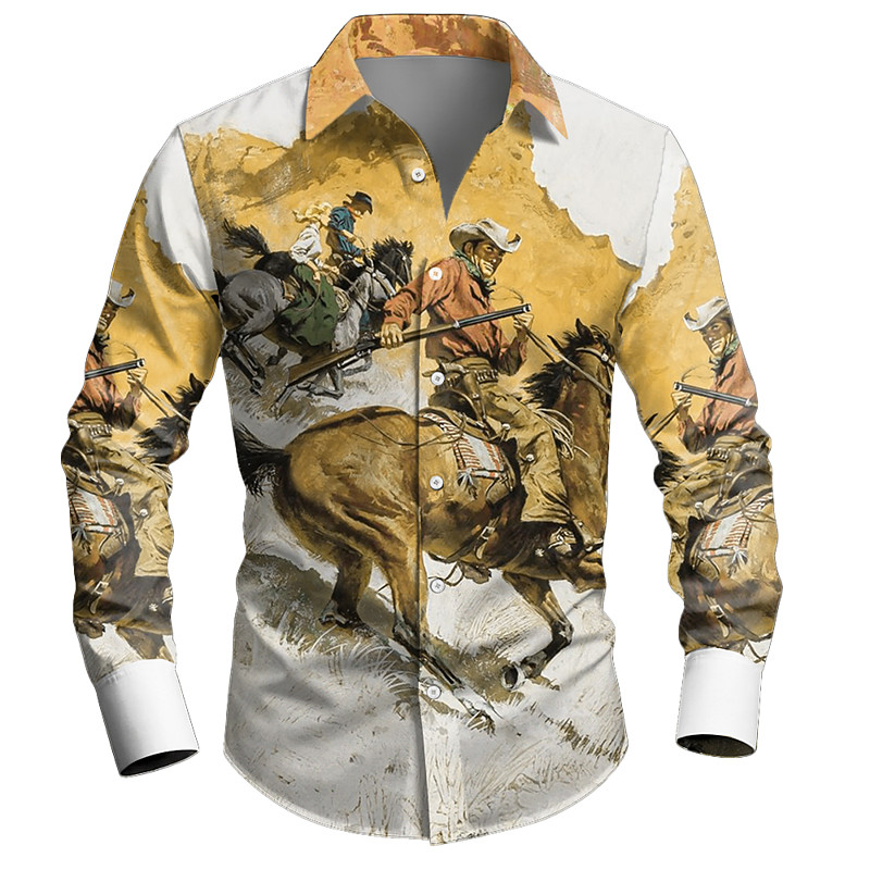 Men's Cowboy Riding Horse Shirt Western Shirt Cowboy Shirt Long Sleeve Vintage Retro Casual Outdoor WorkWear Spring Fall Turndown 3D Print Button Up Shirts Yellow Orange