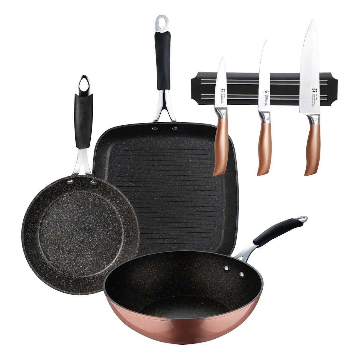 BERGNER Copper - Grillpfannen-Set 28x28cm, Wok Ø28cm und Bratpfanne Ø20x4,5cm aus geschmiedetem Aluminium mit Beschichtung inklusive Küchenmessern