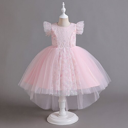 Abito da damigella d'onore bambina Ragazze Abito formale Abiti da sposa Feste Matrimonio Formale Adorabile Principessa Dolce Patchwork Rete Floreale Maniche Corte Girocollo Blu Rosa Dai 4 anni in su