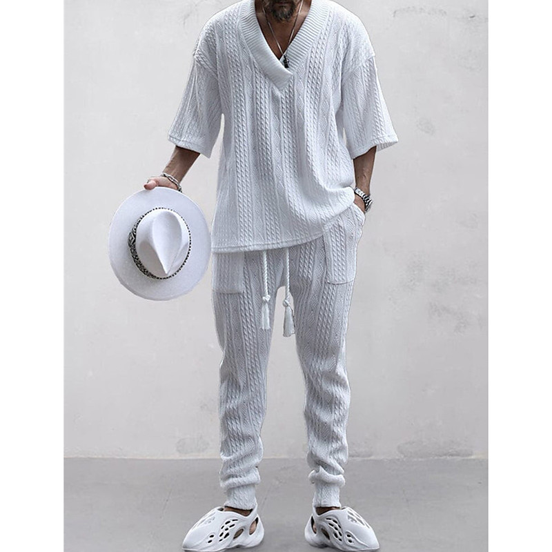 Men's T-shirt Suits Tracksuit Tennis Shirt Tees and Drawstring Long Pants 3/4-Length Sleeve V Neck Spring Fall Plain Gymnatics Casual 2 Piece Knitting Vacation Daily Wear Activewear Black White