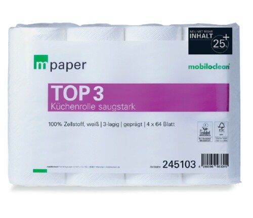 Cleanclub Küchenrolle Top³ hochweiß 3-lagig - 64 Blatt pro Rolle - 32 Rollen