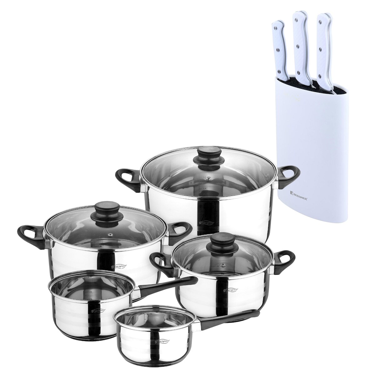 BERGNER - Kochgeschirr 8-teilig 16/18/20/24/28 cm aus Edelstahl, induktionsgeeignet, mit 3-teiligem Messerset aus Edelstahl