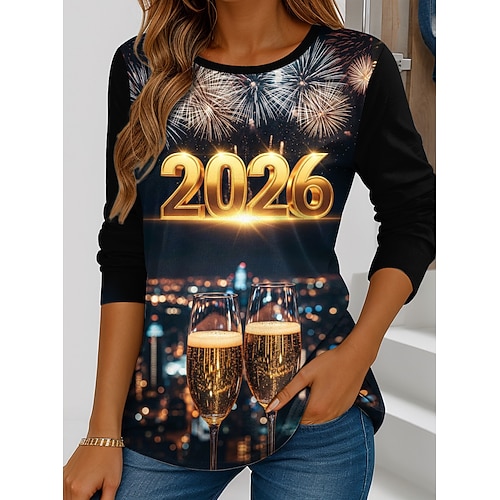 Capodanno Per donna Maglietta Grafico Moda Moderno Manica Lunga Girocollo Top Regolari Quotidiano Weekend Stampato Blu Nero Vino Rosso Blu Reale Autunno Inverno