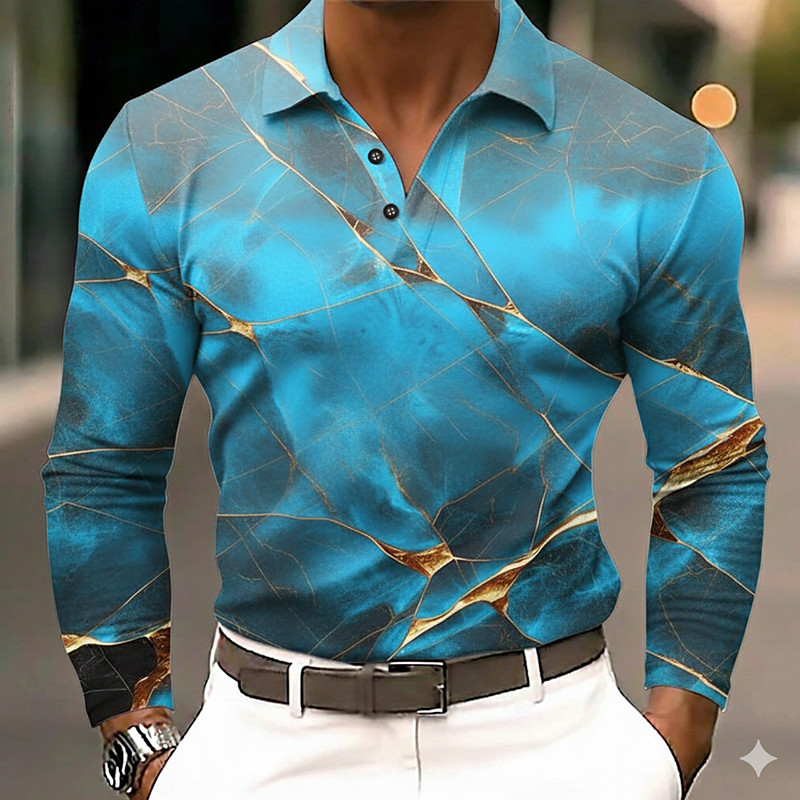 Men's Abstract Marble Polo Long Sleeve Polo Shirts Lapel Casual Street Athleisure Daily Wear 3D Print Buttons Spring Fall Winter Blue Red Purple