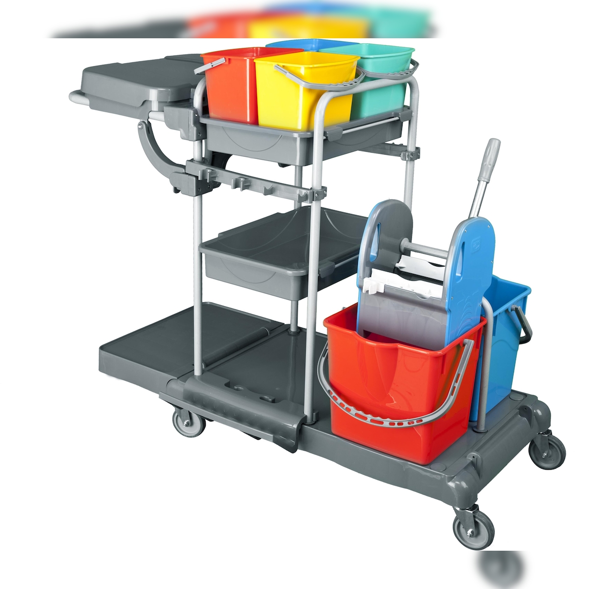 CleanSV® Deluxe Profi PE Reinigungswagen Putzwagen, mit Moppresse, 2 x 17 Liter Eimern, 4 x 5 Liter Eimer, 3 Ablagen, Müllsackhalter