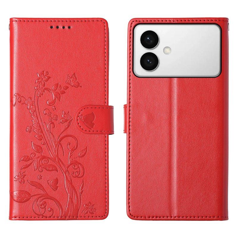Samsung Galaxy S26 Edge Plånboksfodral Konstläder Fjäril Blommönster - Röd